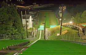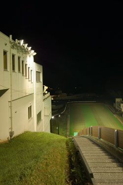 図5にノーマルヒル夜間点灯状況,図6にミディアムヒル夜間点灯状況,図7に飛型審判棟壁面投光器(ランディングバーン用)夜間点灯状況を示す。