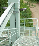 使用ランプは紫外域の光を90%以上カットしたUVカット形メタルハライドランプ400W(MF400LSH/U-UVC)を採用し,虫の誘引性を低減した。図3,図4に無接点昇降式照明灯の設置状況を示す。