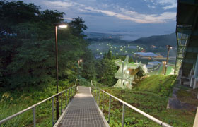 ジャンプ台利用者が昇降する階段部は,FHT42W用防犯灯LUNASTREET®(FH7903EH1)を採用し,ノーマルヒルとミディアムヒル間の連絡通路部は,歩車道用照明器具コパズー™(H58782))にセラルクス®70W(MT70CE-W/S)を組み合わせて競技者に対する必要最低限の明るさを確保している。