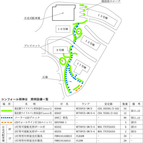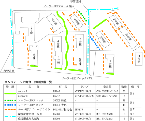 ルーバ形アプローチライトは,住戸周縁部や住戸出入口付近に,連続的又は局部的に配置している。また,環境配慮形照明器具のポール灯及び同共架灯は,移管道路に配置している(図7,図8,図9)。