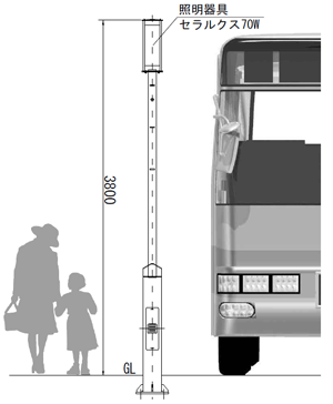 人に親しみを与える高さ,また走行の多いバスの運転に支障をきたさない(運転手の目線に光が入らない)高さとして,ポールの高さを3.8mと設定した(図3)。
