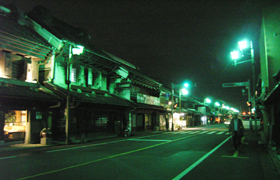 今回,商店街を通る県道の歩道部分で石畳の整備が実施されることに伴い,老朽化した街路灯に変わる新しい街路灯の提案が求められた。「伝統的建造物や修景建物のライトアップを町並み照明の中心とする」「街路灯は昼間の景観にも配慮し,高いポールは避け足元を中心に照らす」「小さな灯にも工夫する」などの条件のもと設計競技が行なわれ,当社の提案が採用となった(平成19年5月竣工)。