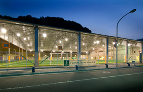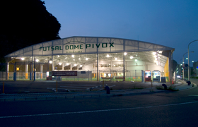 フットサルドーム・ピヴォックス広島は,広島県南区元宇品町に位置する,天候に左右されずいつでも利用できるドーム型フットサルコートである(平成18年12月完成)。屋根は光触媒テントを使用し,十分な明るさを得ながらも紫外線を98%以上カットしている(図1,図2)。サッカーの国際大会会場や,欧州の名門クラブの練習場などでも使用されるロングパイルの人工芝「モンドターフ」を使用しており衝撃吸収にも優れた高品質フィールドである。本稿では同設備の照明手法や設備概要について紹介する(図3)。