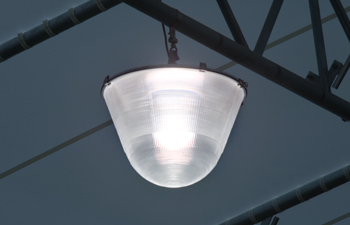 施設は天井が比較的低い(灯高4.5~7.3m)ため,スポーツ施設で多く採用されている投光器を用いた照明では,競技者がグレアを感じやすい。本施設においては全面プリズムグローブ形照明器具バーサビーム™(HSLC4001)を採用することでグレアを軽減した(図4)。バーサビーム™はGE社の特許技術であるプリズム構造により配光を制御したプリズム付きグローブでランプを覆うことによりランプからの直射光がなくなり不快グレアを軽減している。