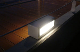 光源は,演色性に優れたセラミックメタルハライドランプを使用し,温かみのある3200Kの光で,夜の水族館を魅力的に照らしている。広場部・サカナリーフでは,広い範囲を均斉よく照明するため,ポールライトを配置している。高さは,梯子でメンテナンスをする事を考慮し,H=3.5mとしている(図5)。通路部では,フットライトのみを配置して明るさを確保している。一部通路脇に露出配置になり,取付位置の制限や防護柵の形状を留意し,特注のフットライトを採用している。また,導線が複雑なため,フットライトの裏側が見える場所があり,背面からも光の出るタイプを使用し,アイキャッチ効果を考慮している。(図6,図7)