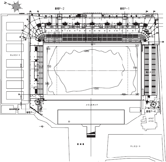 鉄塔の配置は,既設競技場の都合上メインスタンド側とバックスタンド側とで異なる。