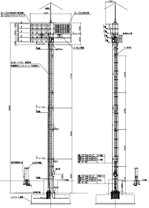 鉄塔基礎は,コンクリート直接基礎構造であり,競技場GL面レベルからの高さを統一するため,設置箇所により約3~6m深く掘下げている。鉄塔ハッチ部の高さは,鉄塔設置する地表面よりGL面+1.0m地点になるように設けた。