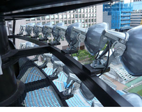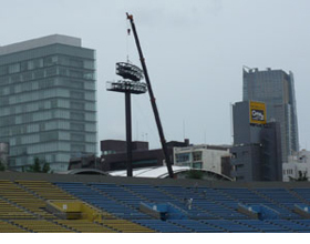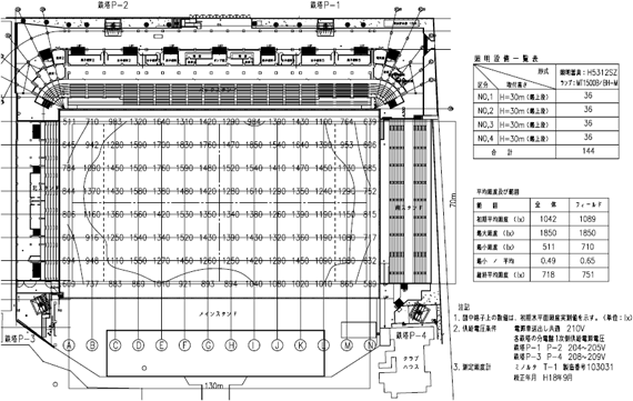 メイン側は観客席屋根を回避するコーナーに2箇所配置し,バック側は観客席裏側サイドに2箇所配置するもので,変則4基制の配置である。(図3)