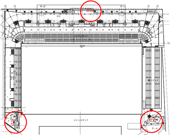 仮設電源は,ナイター試合当日に発電機搭載の特殊車両[電源車]を3台 競技場内の鉄塔付近に配備を行なっている。(図10)