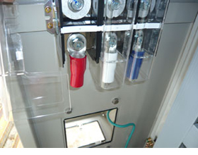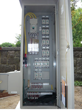 電源車から仮設電源ケーブルは,塔下の自立型分電盤に接続し,手動操作を行なっている。自立型分電盤は,筐体横に図13に示す仮設用電源ケーブル入線窓(下面口)を設け,立上りケーブルが盤内に入線しやすく,かつ,端子に接続しやすい縦長の構造にした。(図14)
