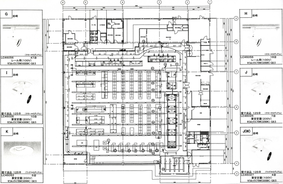 キューピット出来島店の既存照明設備は,FHP105W2灯用逆富士形蛍光灯を全般照明に使用し,ハロゲン電球スポットライトを局部照明に使用されていた。(図2)
