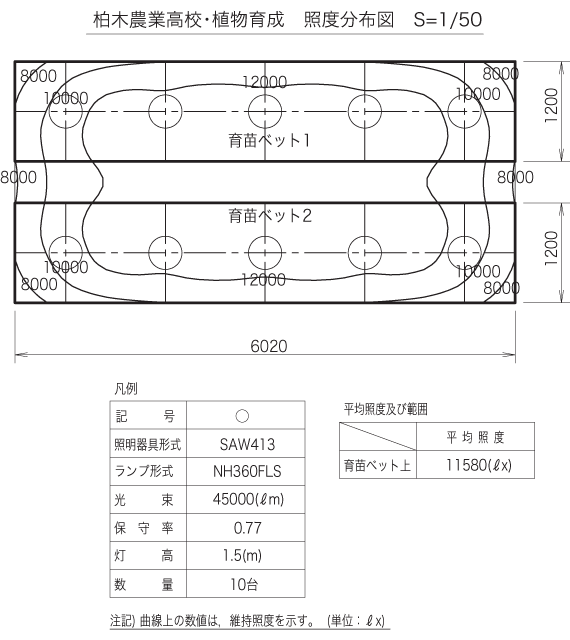 本施設の設計照度は,育成植物であるレタスの光補償点1500ℓx,光飽和点25000ℓxの中間近似値であることと,快晴の青空における全天空照度が10000ℓxであることから,設計維持照度11000ℓxに設定した。