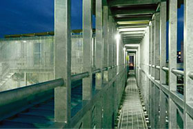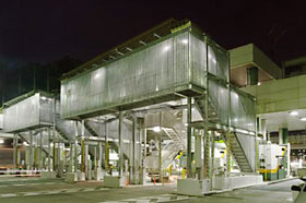 この施設は,約300mの通路部と各ブース・休憩所に降りるための階段を有する,3階建ての壁のない簡易構造となっている。主に,人が通行するのみの施設であるが,施設下部および周辺は高速道路であり,車の往来が常にある施設となっている。