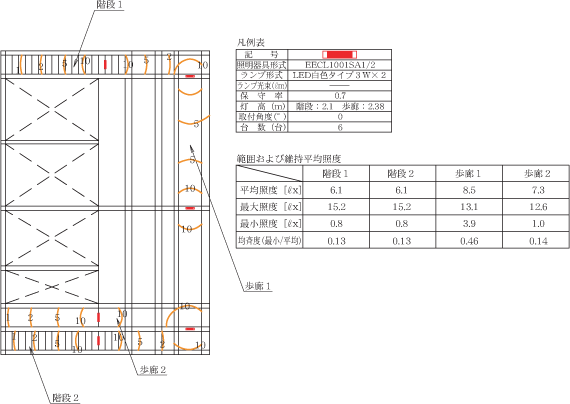 照明器具の配置においては,配光特性を考慮し,基本的には通路・階段の中央部に配置した。(図5,図6,図7)