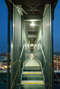 高速料金所内の通路・階段で,人が使用する施設でありながら,通行車輌からの見え方等も考慮した設計を行ったことで,双方が利用しやすい景観を創り出している。