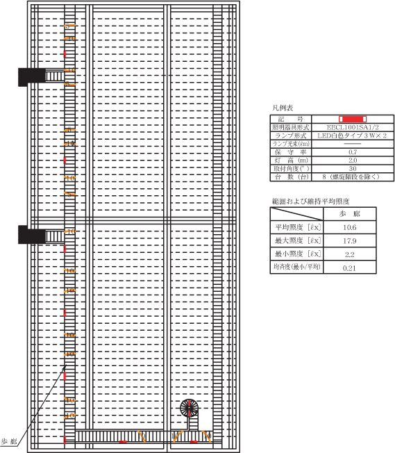 半屋外空間であること,人のみが通行する施設であることを考慮し,人の顔が認識できる水平面維持平均照度5ℓx以上を通路・階段・踊り場それぞれで確保する。 - 不快グレアの軽減