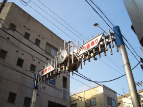 街路灯には,スピーカーや交通標識,商店街サイン看板などが取付けられ,商店街としての活気や賑わいを高め,安心,安全を向上している。(図7,8)