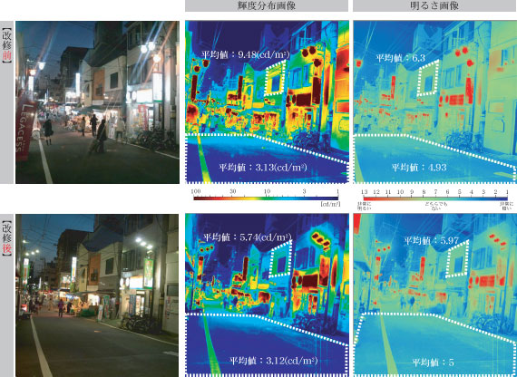 今回,当社の光環境評価システムQUAPIX™(クオピクス™)を用いて,改修前と改修後の商店街照明の評価を行った。クオピクスの測定では,路面の明るさや輝度は改修前とほぼ同等であった。鉛直面については,明るさ・輝度ともに低く抑えられるので,鉛直面の明るさを求められる場合には,器具選定や街路灯デザインにおいて検討が必要となるが,2階部分が住居で窓などがある場合には,光害抑制としての効果を期待できる。(図9)