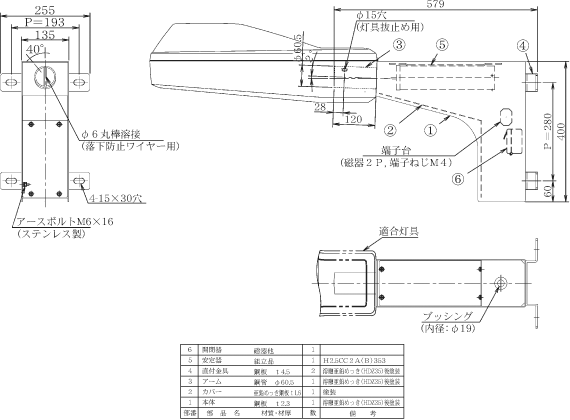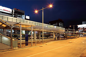 バスターミナルには,周囲環境への光害に配慮し,上方への漏れ光が少なく,デザイン的にも優れた2灯用照明柱H6160を12基設置した。光源は高効率(120ℓm/w),長寿命(24000h)の高圧ナトリウムランプ220W(NHT220LS)を採用し,省エネルギー,省メンテナンスを図るとともに十分な明るさを確保している。また,メンテナンス時の安全面にも考慮し,ランプ交換時の器具枠の落下を防止する為,落下防止ワイヤー付とした。(図3,4)
