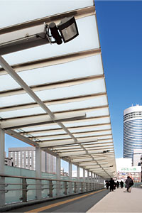 デッキ部照明については,デッキ屋根部分に安定器内蔵形の小型投光器HCF0771BHEを57台設置した。これは,デッキ屋根部に安定器を置くスペースを確保するのが難しかったことと,歩行者の目につきやすい位置に取付くためコンパクトですっきりしたデザインのものという点を考慮して選定した。歩行者用照明ということで,光源には演色性の良いセラミックメタルハライドランプ70W(MT70FCE-DW/S)を採用し十分な明るさと良好な視環境を確保している。(図7,8)