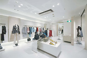 演色性の高いセラルクス®70Wを中心とする,L-CUBE™ユニバーサルダウンライトを採用し,温白色の光で全体を温かく包み込む店内は白を基調とした透明感のあるシンプルな空間となっている。売場のレイアウトに合わせて器具,ランプは配光を的確に選定し,光にリズムを持たせ,主役となる商品に演出効果を持たせ,立体感のある照明環境を作り出した。