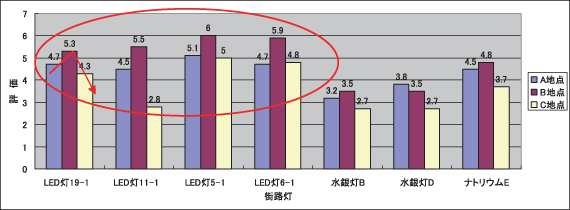 実験対象区間内の街路灯1スパン間での移動観測による静止印象評価結果を,LED,高圧水銀ランプ街路灯及び高圧ナトリウムランプ街路灯に関して図7-3に示す。
