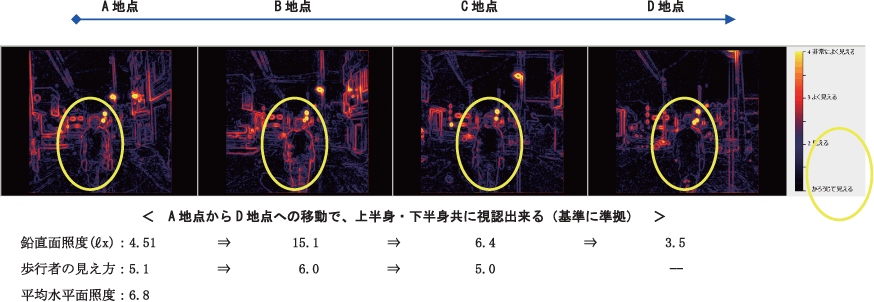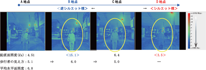 A地点からC地点への移動観測による静止印象評価結果の一例(写真7-1:LED街路灯5-1)としては,図5-1の実験手順図より,個人差はあるものの概ね,A地点からB地点への移動で【評価刺激(人物)に直射光があたり(15.1ℓx)逆シルエット視となり見え易くなる領域となり】1ポイント上がり,次にB地点からC地点への移動で【逆シルエット視とシルエット視の狭間にあたり視認しづらい領域となり】1ポイント下がるか,A地点と同等ポイント傾向となり,さらに,C地点からD地点への移動により【評価刺激(人物)に直射光が当たらない(3.5ℓx)シルエット視の領域】と変化する。