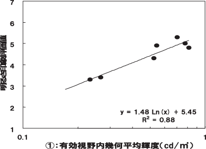 - 「明るさ印象評価と有効視野内幾何平均輝度の相関(図7-6)」は,決定係数:R²=(相関係数)²=0.88となり「強い正の相関」(0.7~1)のあることが判った。