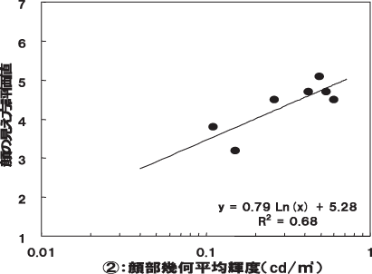 - 「顔の見え方評価と顔部幾何平均輝度の相関:A地点(図7-7)」は,決定係数:R²=0.68となり「かなりの正の相関」(0.4~0.7)のあることが判った。