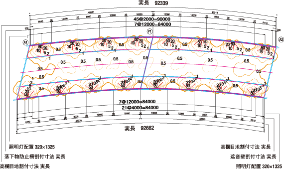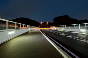 照明設備設置後に,現地にて照度測定を実施し,所要の照度が得られていることを確認し,夜間時における誘導性,歩行者および通行車両に対する不快なグレア等の問題が無いことも確認した。また,隣接する交差点等の局部照明は,高圧ナトリウムランプが採用されており,危険箇所での通行車両に対する光色の差異による注意喚起にも配慮されている。