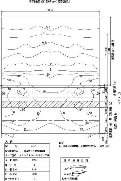 各施設の高架橋,民家周辺,農作物栽培地周辺等に設置する照明において,後方への光漏れの軽減を図る為,後方カット型を設置している。事前に一般型と後方カット型との光漏れを照度分布を作成して比較している。照明器具後方約22.5mの初期水平面照度が一般型で2ℓxであったところが後方カット型では0.2ℓxとなっている。(図9)