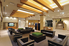 そこで,建築化照明・ダウンライト・ブラケットをミックスし,落ち着いた,暖かい雰囲気を演出した。施設の顔になるエントランス,ロビー照明をLEDに変えると虫の飛来も無く常に清潔で,熱の少ない快適な空間を作り出すことができた。LEDに変えることで寿命が長くなり,メンテンス費用の大きな削減効果が得られる。快適な照明の要素としてあらゆる方向の光があることが重要である。