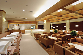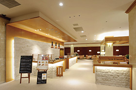 カフェ・レストラン照明は,間接照明・ダウンライト・ブラケット・フロアスタンド・ペンダントをミックスし落ち着いた高級感を演出している。基本は色温度の低い白熱系になるが,ベース照明にセラルクス®R 35W(3000K),演出照明にLED(3000K)を選定した。