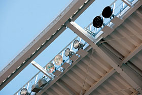 メインスタンド取付器具は,屋根上部に設置するのではなく,スタンド屋根下に配置することにより,昼間の景観上,照明器具が目立ちにくく配慮されている。これにより,夜間の上空へ漏れる光を抑制でき,器具の点検は,メインスタンド屋根に設けられた開口部またはキャットウォークより行えるようになっている。図2,図3,図4,図5に照明器具設置状況を示す。