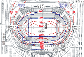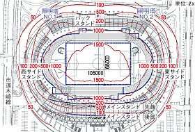 図6,図7にサッカー1500ℓx点灯時の水平面およびメインスタンド側から見た鉛直面照度分布図を示す。また,図8に点灯状況写真を示す。
