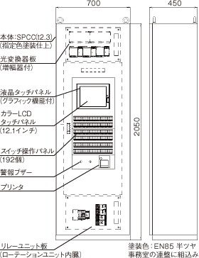 本施設の照明制御には,多重伝送方式(I-TACS Lシステム)が採用されている。照明操作盤は,管理事務室に設置されており,他設備の盤と列盤となっている。信号線には,光ファイバーケーブルを使用,タッチパネルのグラフィック画像を見ながら簡単に操作が行えるようになっている。図9,図10に照明操作盤外形図およびタッチパネルグラフィック画像を示す。