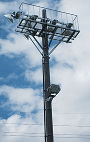 照明柱(コンクリート柱)の高さは,取付高さが高すぎると鉛直面照度が低下し,見え方が悪くなり,取付高さが低すぎると照明範囲が狭くなり,グレアの影響も出てくる。馬場照明は,経済性と見え方,グレアを考慮した最適な高さとして地上高14.9mとしている。また,保守点検が容易に行えるように照明柱の架台には点検台を設け(図16),安定器は地上に安定器専用架台を設け設置している。(図17)