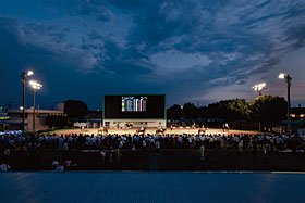 広場照明は,スタンド上および第4投票所の上部にLED400W形投光器ブリッツ(E4021N/SA1/2.4,E4022N/SA1/2.4)を設置し,消費電力の削減と共に狭角配光と中角配光を使い分けすることで,第5投票所および第6投票所の建屋を避けて照明することが可能である。(図21)