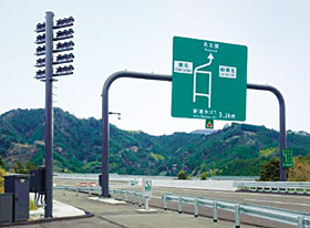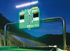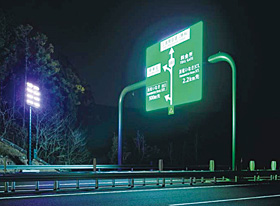 新清水JCT及び,浜松いなさJCTに設置した表示板の施工納入事例を図8~図11に示す。大型標識に採用され,遠方照明方式とオーバーハング方式の2種類があり,可視光を極力カットした光で,標識を鮮明に浮かび上がらせている。