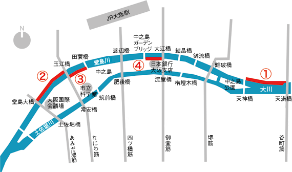 堂島川沿いには中央図書館,市役所,日本銀行,国際会議場などの文化施設,大型のホテル,マンションなどが立ち並び,古くから水路とし,商業・産業・生活の中心的な役割を担い,大阪の発展に多大な影響を与えている河川である。