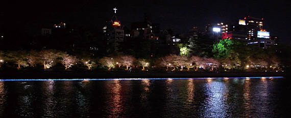 よりよい水辺の景観を創出するため,桜のライトアップだけではなく,水面の演出を行った。