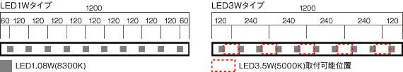 照明器具は施工性,メンテナンス性を考慮し,1台あたり1200mmとし,LEDは実証実験により120mm間隔で配置している。