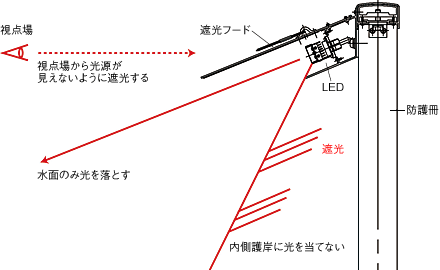 護岸外部の長い区間をラインで照明するため,電力,メンテナンスを考慮し,LEDを採用した。