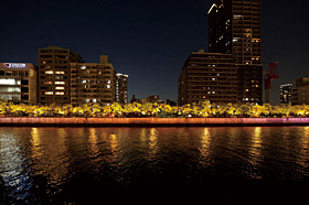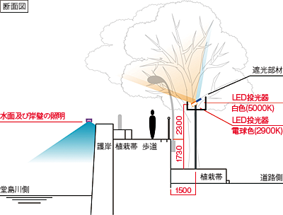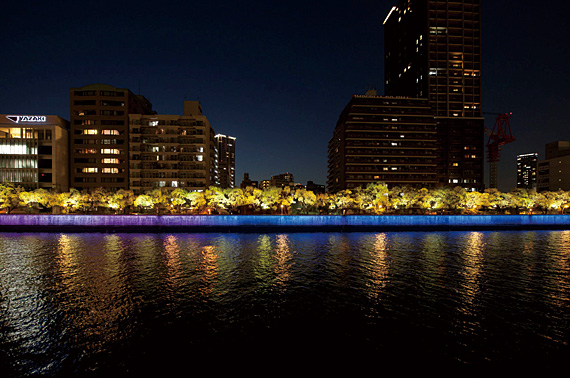 川沿いの樹木(クスノキ)のライトアップは,中之島周辺で主として使用されている暖色系(電球色)の光で上部の葉の部分を重点的に照らし,遠方からの景観と水面への映り込みを強調している。