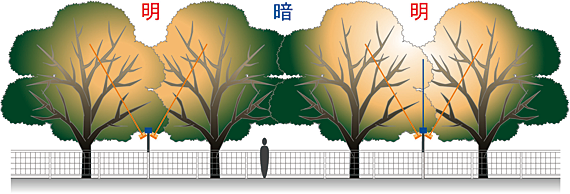 設置位置は樹木横にある歩道上の人の目線より高い位置に設置し,歩道上からのグレアを抑制し,落ち着きのある雰囲気を創りだしている(図19)。