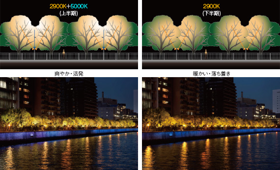 下半期(10月~4月)は,落ち着いた雰囲気とするため,2900K(電球色)とし,暖かなイメージを創る。