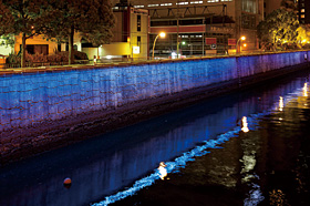 水面・護岸照明は,常時の演出を「水」をイメージした演出とし,「青色」を基調とした光のグラデーションを上流から下流にかけて徐々に光を変化させ,流れているイメージを創りだしている。