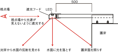 視点場である対岸からの景観に配慮し,遮光フードにより視点場から器具の輝度を隠し,照らされている護岸,水面のみを見せることで,少ない光量で十分に視認できる演出となっている(図24)。