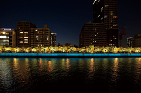 落ち着きの雰囲気の中で屋外において460mのライン照明は類を見ない演出であり,河川沿いのダイナミックな夜景を映しだし,特異な表情を創りだしている。