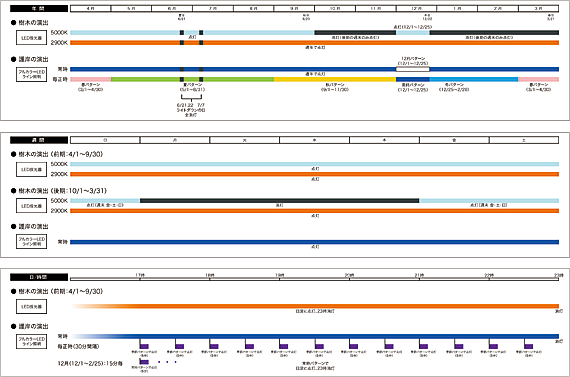 樹木の演出は,ウィークデー(月~木)と週末(金~日)とに分けて演出している。